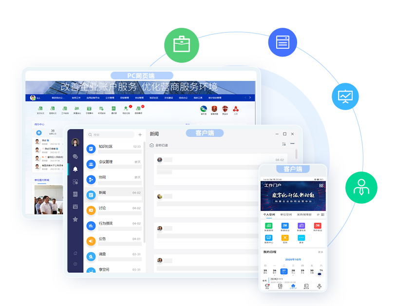 支持为组织、角色、业务/职能搭建不同的PC和移动门户,为组织提供统一、多元、集成、安全的数字化工作空间。