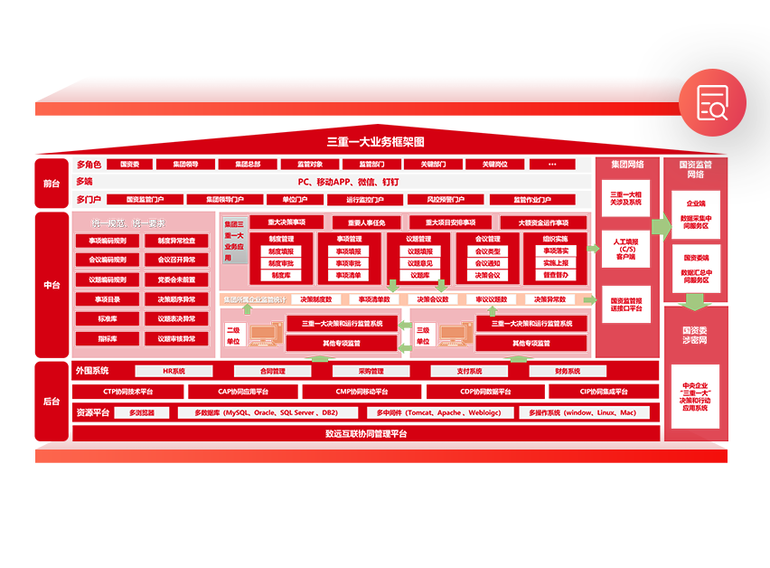 实现科学、合规、高效的“三重一大”管理、分析和预警机制,实现对集团“三重一大”事项决策制度、规则、清单、程序、台账和落实等情况的全过程监督和智能化管理,并实现和国资委数据报送的对接。